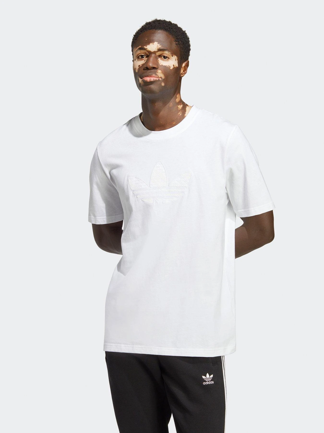 - One Trefoil makes an outfit, so wear it on repeat and you’ve got a game changer. The iconic logo doubles down on this adidas t-shirt, showcasing a monogram print in monochrome style. Soft cotton jersey makes it extra comfortable, and a ribbed crewneck adds the cosy detail.