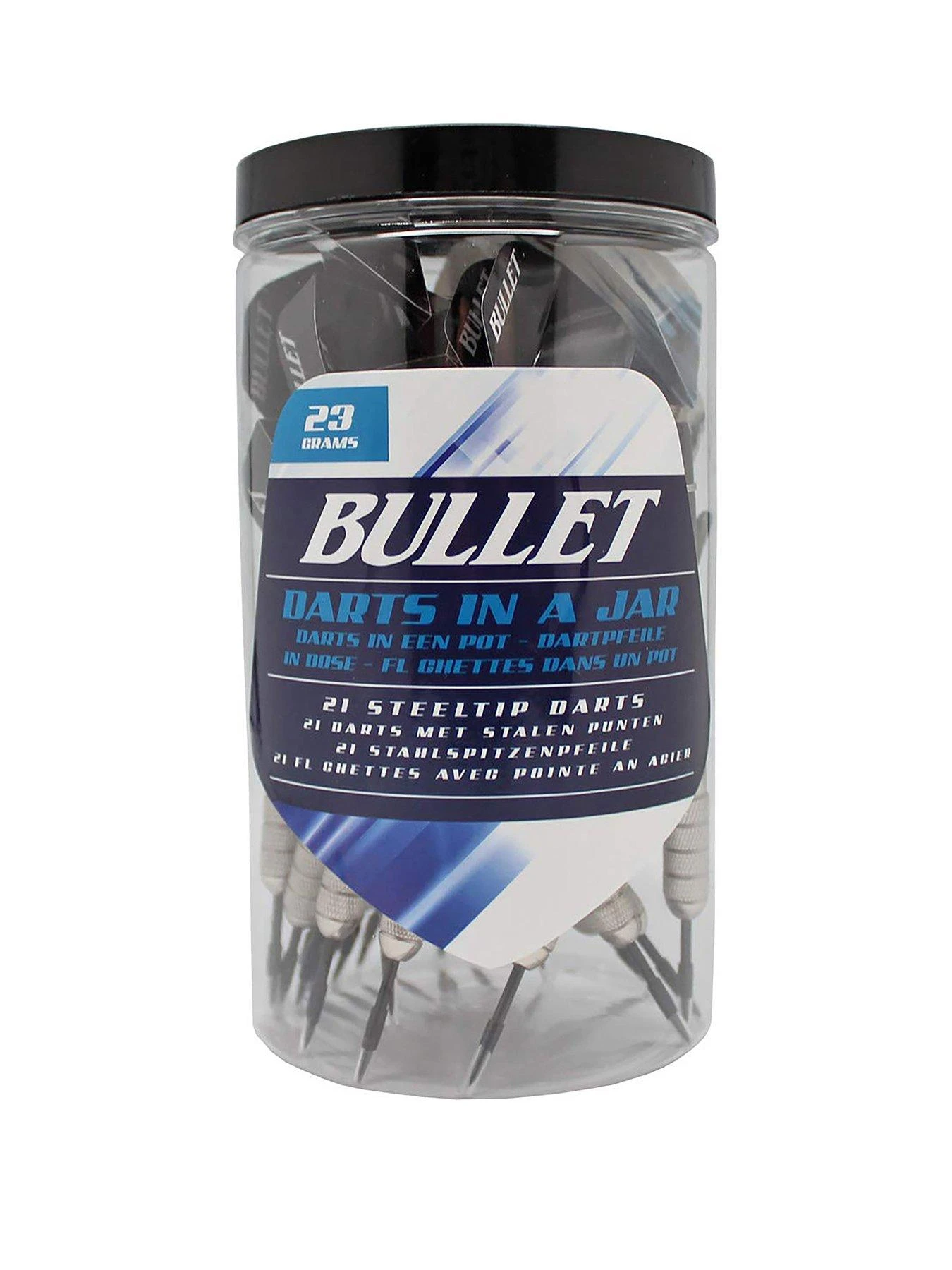 The Bullet Darts In a Jar Set includes 21 steel tip darts for competitive play.