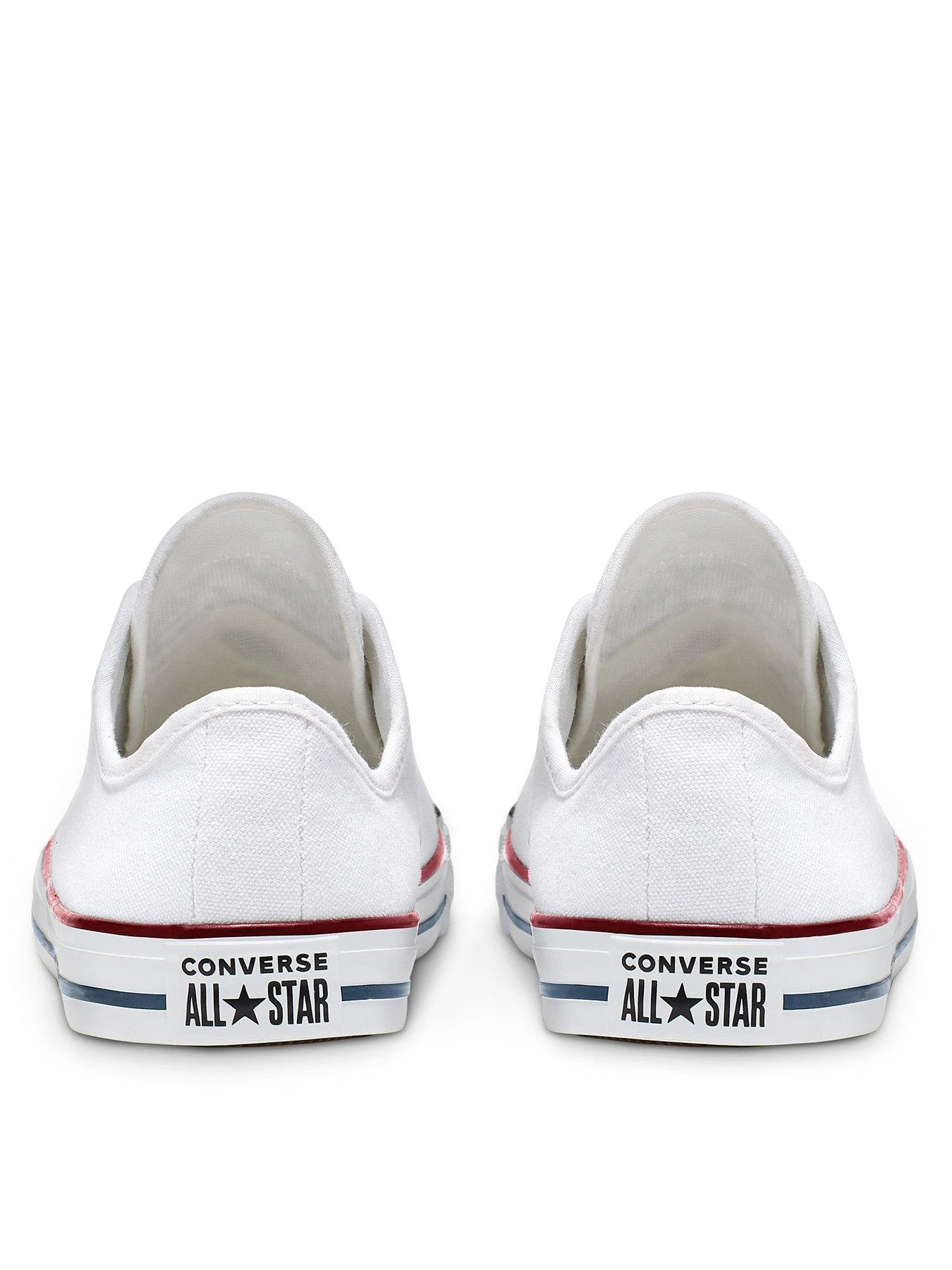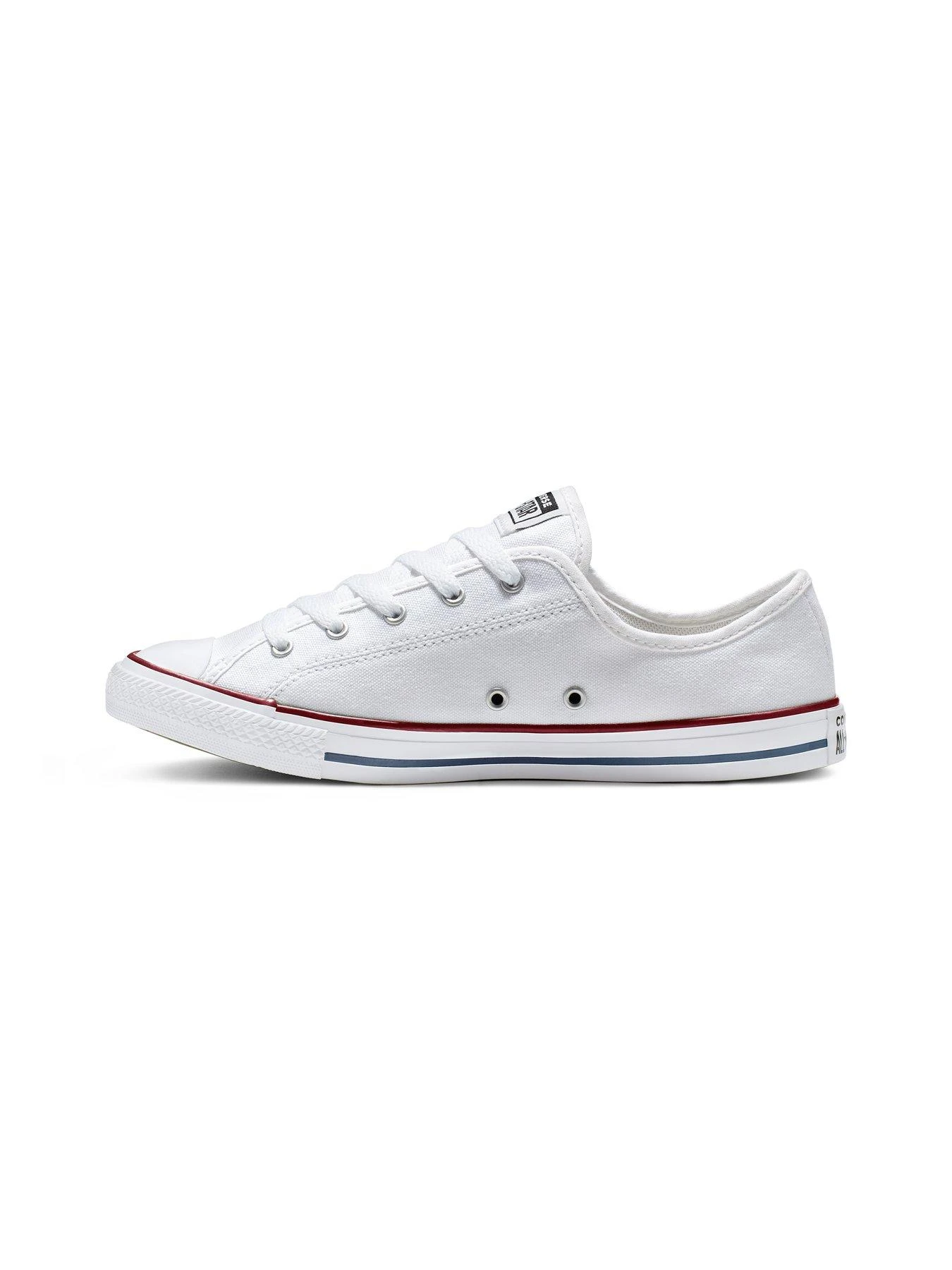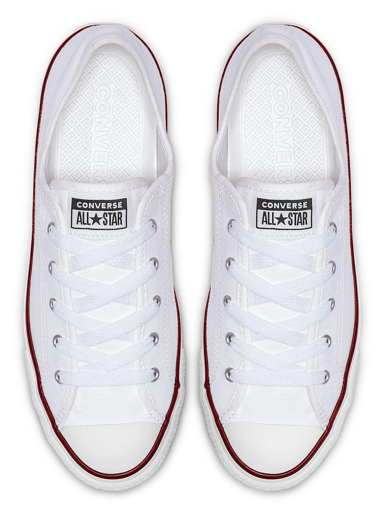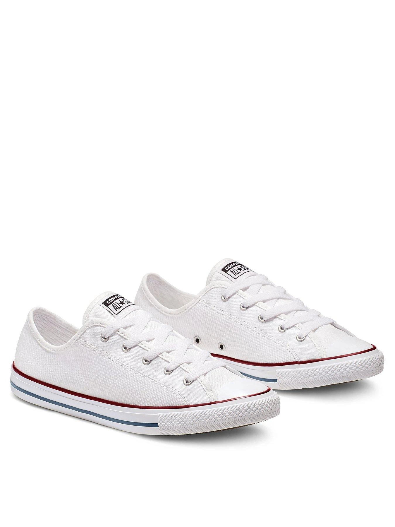 - One of the most famous and recognisable plimsolls on the planet, the Converse All Star is a casual shoe that’s perfect for off-duty wear. The Dainty version of the plimsoll features a low cut design, lace fastening and a toffee bottom sole with a white leather upper. They also have the legendary All Star logo to the tongue and heel for a stamp of quality and as a reminder of the history of this legendary footwear brand.