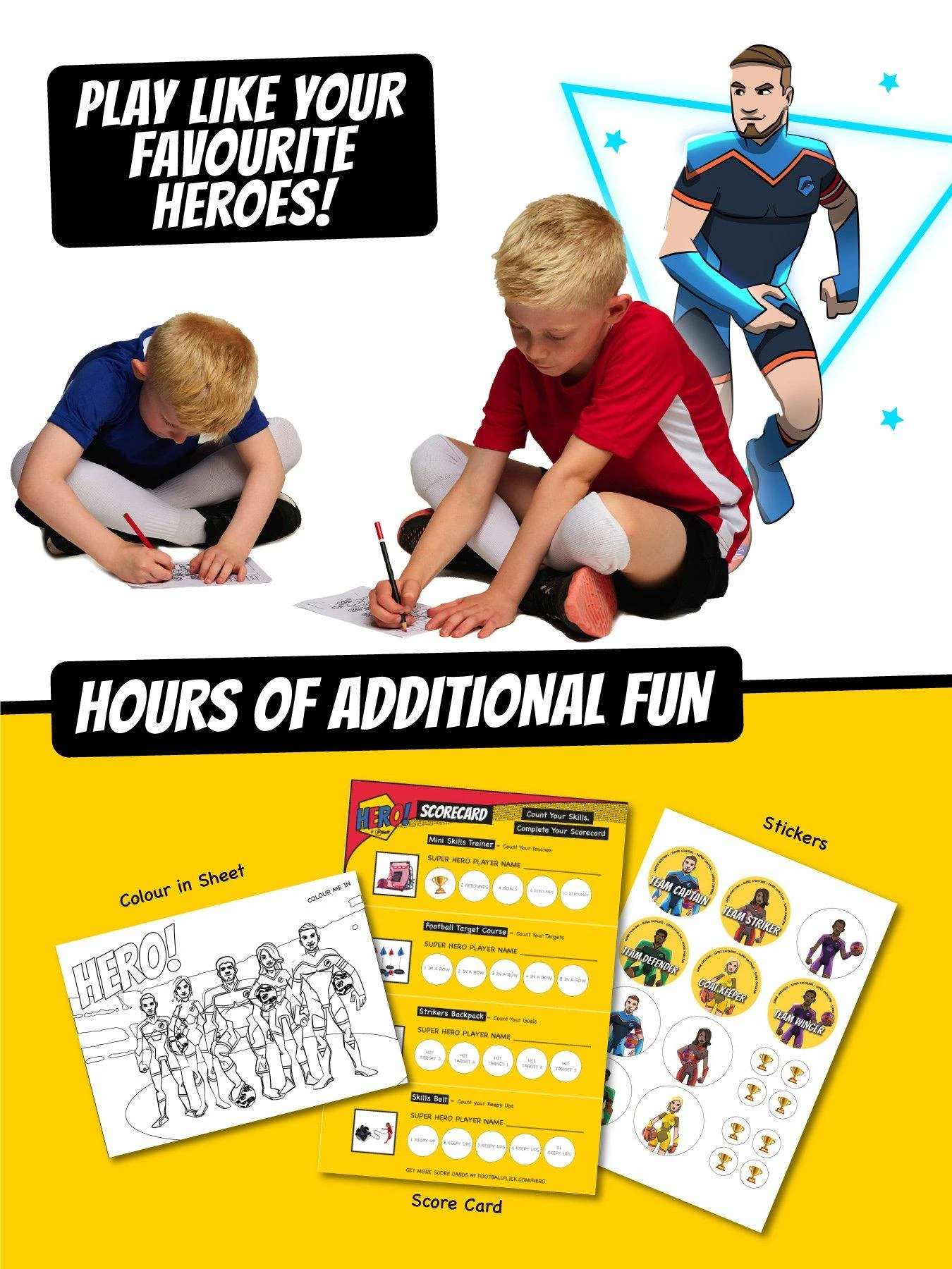 Start your football journey and play like your hero with the new Hero! range by Football Flick. The Football Flick Hero! range is all about fun and imagination. It has been specifically designed for junior players aged 3-7 to express themselves through play. The range is an introduction to the world of football, providing hours of fun and entertainment. The Hero! Strikers Goal Pack has been specifically designed to help young players have fun whilst improving shooting and accuracy. The design means you can pop-up and pack away the goal in seconds. Includes its own backpack for easy travel and storage. Reversible design means you can use the goal as a target goal or standard goal. Its compact size means the Hero! Strikers Goal Pack can be used indoors or outdoors. Even better than that, the pack also includes a range of other fun superhero activities including stickers and colouring in sheet that’s sure to entertain for hours. There’s even a score card so you can track and share achievements with friends and family. Don’t forget, every Hero! product includes a FREE downloadable football flick mobile game so you can take your game anywhere!