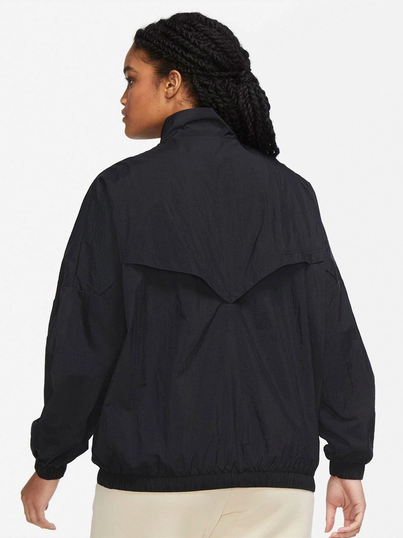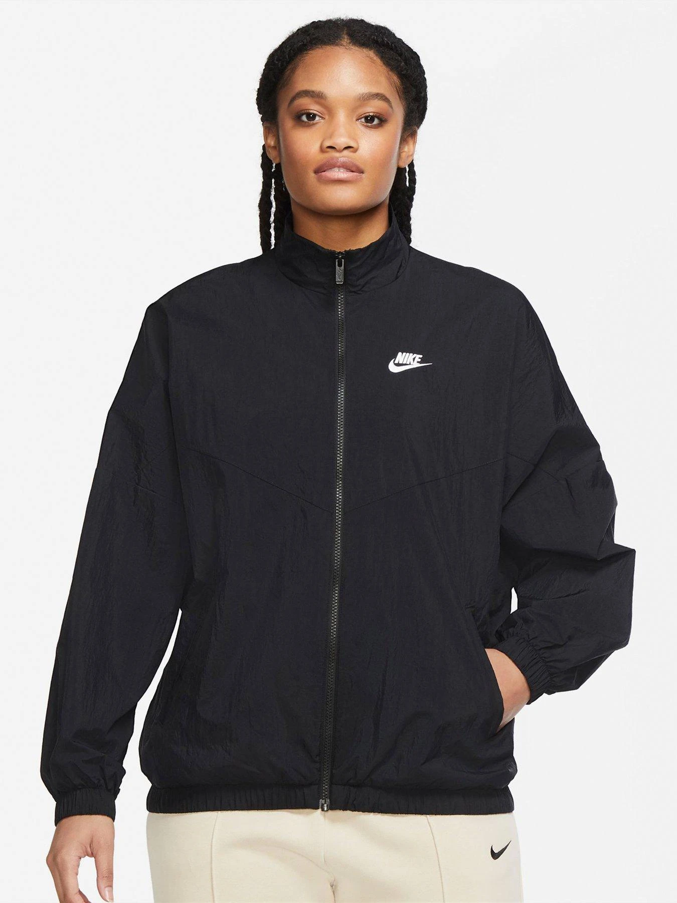 - The Nike Sportswear Woven Jacket updates the original with an easy-to-layer fit and a longer cut for added coverage in cold, wet weather. Its weather-resistant fabric features mesh lining and back vent help keep you comfortable in changing temperatures.