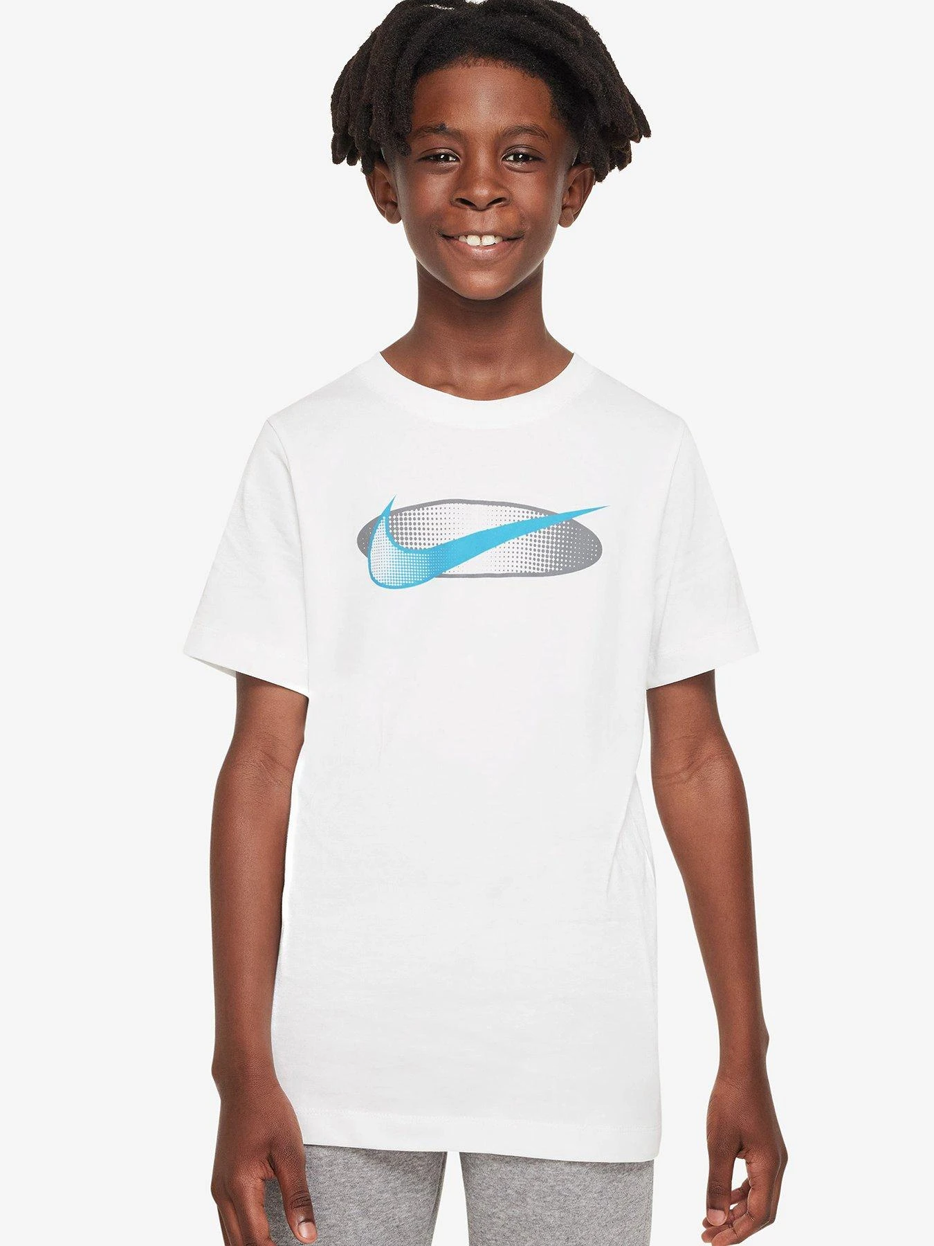 - Elevate their basics with the statement Swoosh logo and and cool colourway of this Nike tee. A Swoosh to the chest adds their seal of approval, while the short sleeves and crew neckline ensure classic coverage.