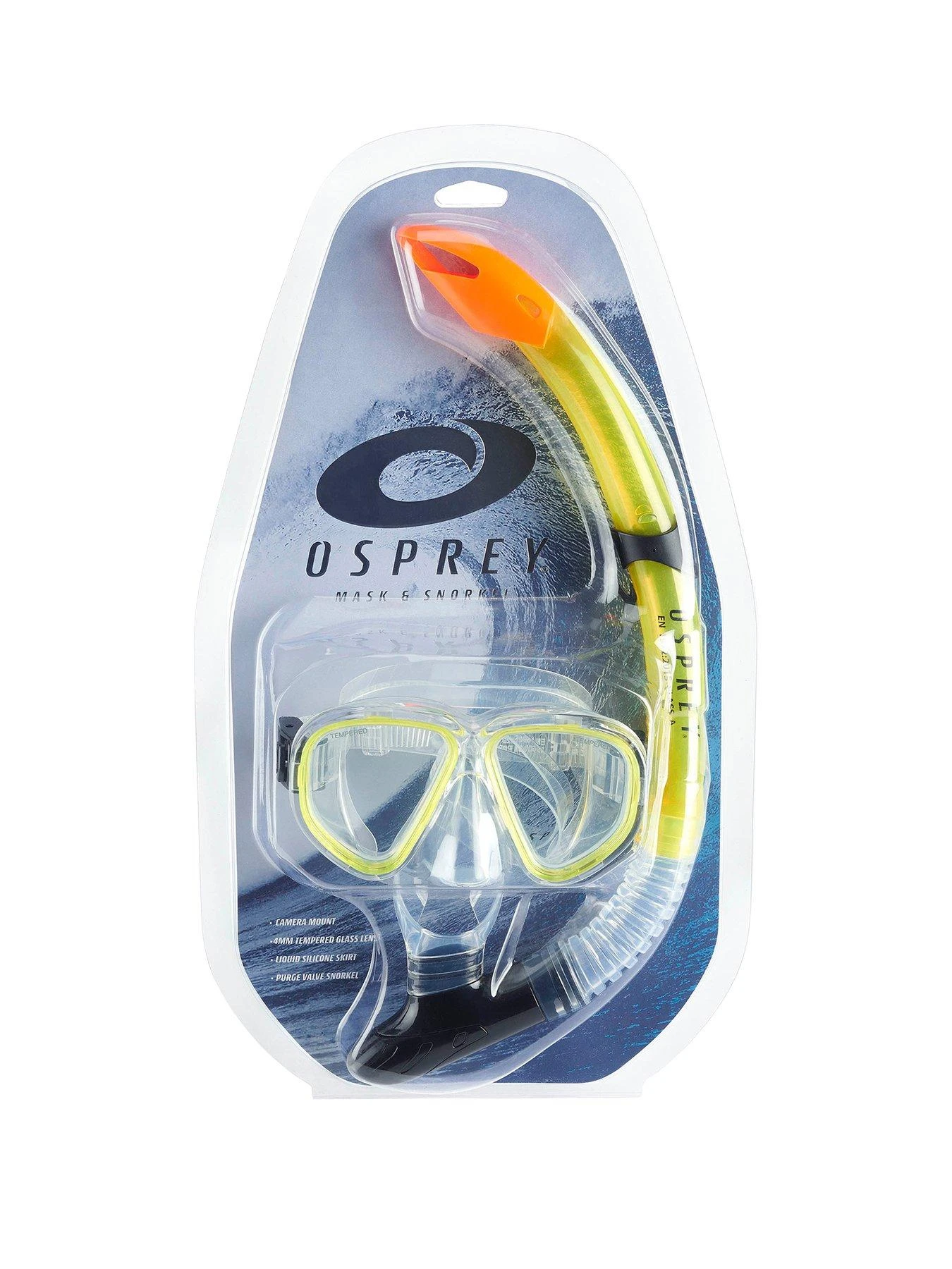 Explore beneath the surface with the Osprey Mask & Snorkel Set in yellow. Providing great visibility underwater thanks to the 4mm tempered glass dual lens design, this snorkel set is perfect for swimming in the sea or having some fun in the pool. Including a silicon skirt edge and adjustable strap, the mask provides an airtight and comfortable fit.The included snorkel can also clip neatly onto the side of the mask, so you can concentrate on exploring the underwater world!