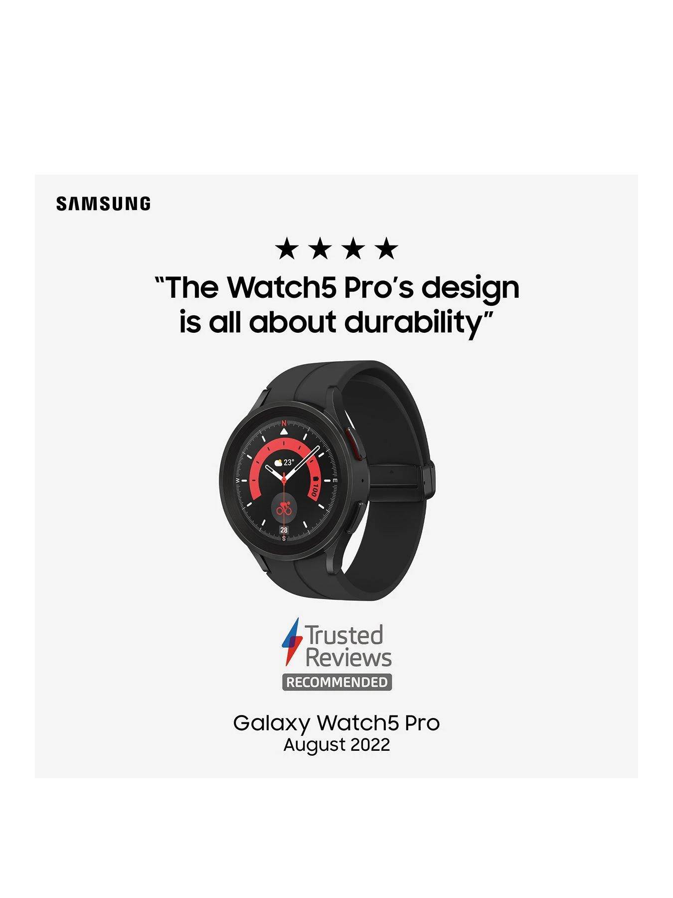 - Galaxy Watch5 Pro is built for adventure, with sapphire crystal glass, a tough titanium frame and a magnetic D-buckle strap.