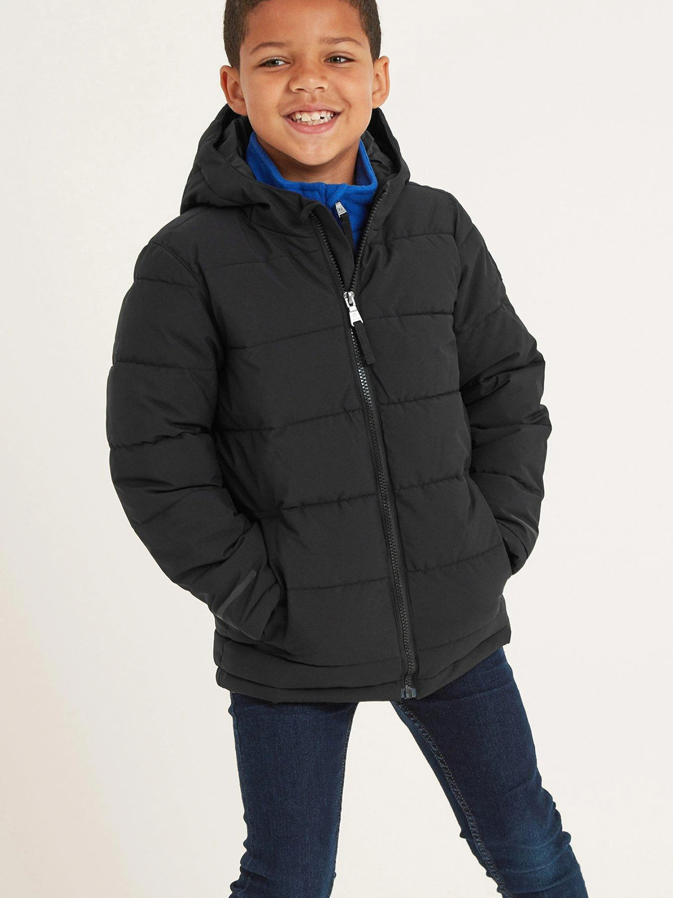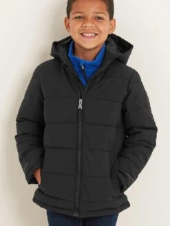 Super warm and wind resistant, our Harecroft premium quilted jacket for boys stands up to adventures outdoors on the coldest days and makes a great school coat too. Designed in West Yorkshire, where we know how to dress for the wildest winter weather, this coat is quilted in chunky baffles and has a warm, insulated filling and two lower pockets that double up as hand warmers. It has a fixed, insulated hood with a Vecro adjuster tab at the back, so it can be shaped around the face to keep the wind at bay. There is a full length, easy pull zip at the front in a tonal colour to match the lining and, for safety, there are neat reflective prints above the cuffs and back hem that stand out against car lights for increased visibility at night. Just like our adult jackets, you’ll find our iconic embossed rubber Yorkshire Rose badge on the sleeve.